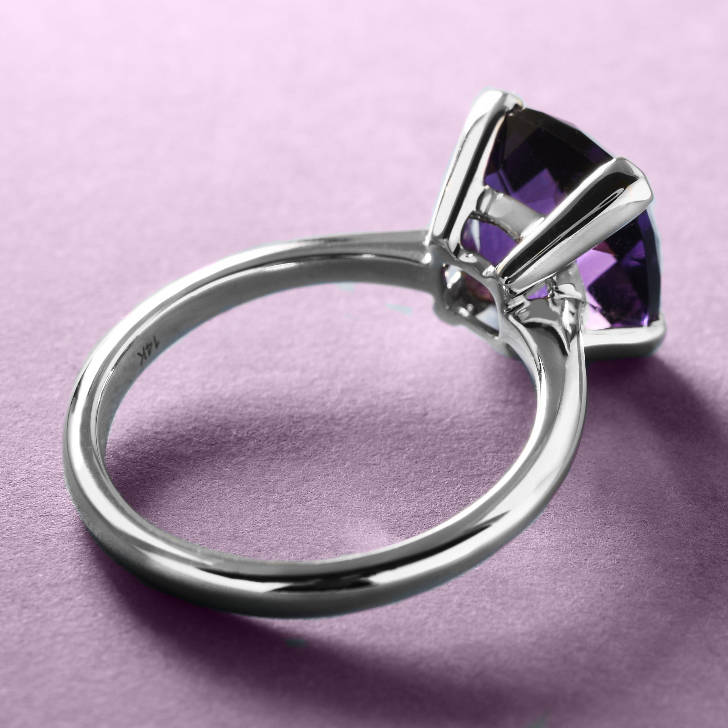 A big, juicy purple amethyst is the main event of this colorful ring! The ring is 14 karat white gold, with "v" style prongs to securely hold the cushion-shape amethyst. ...