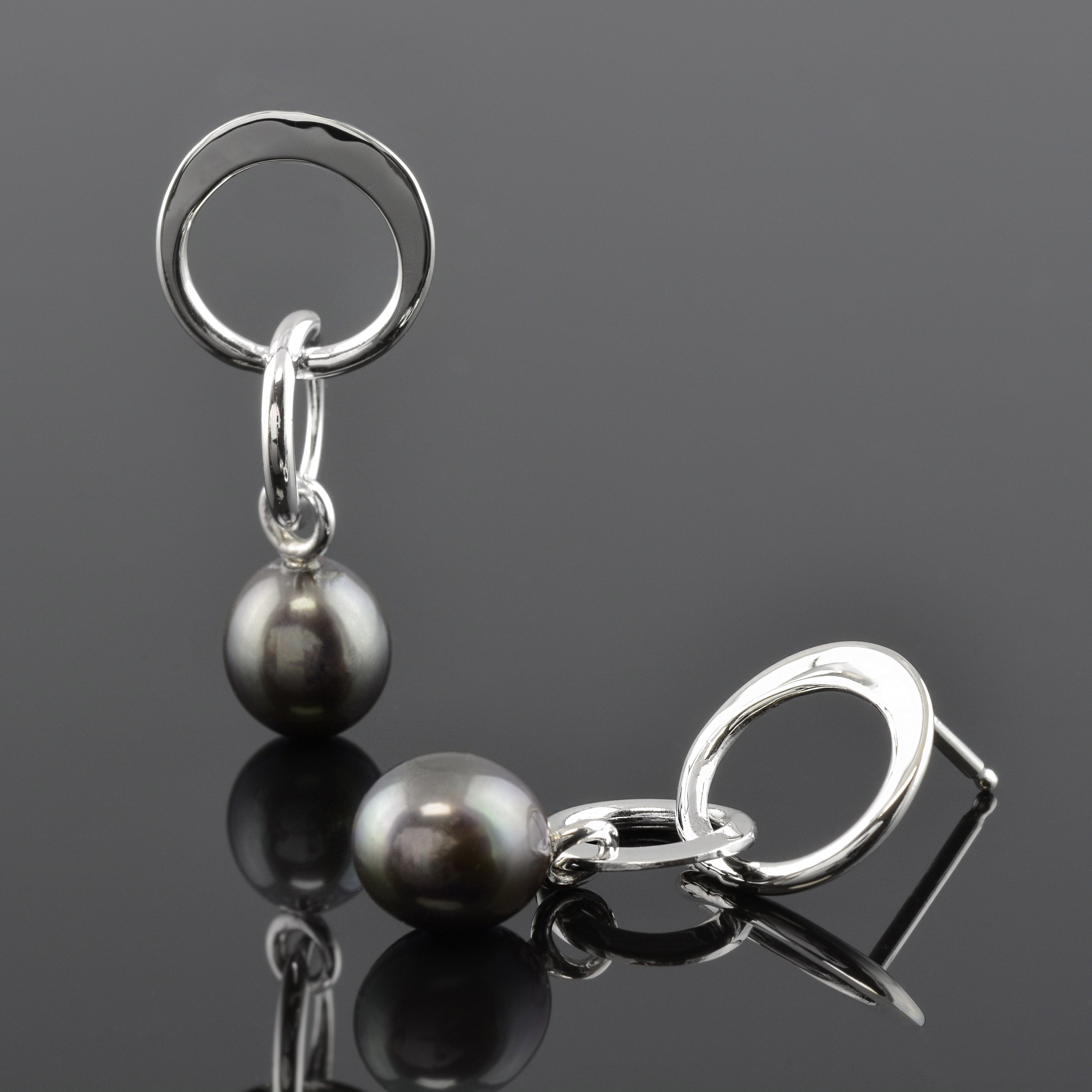 A mysterious black freshwater pearl with a gorgeous play of color sits within an overlapping circle of sterling silver. The pendant has been hand forged in Massachusetts by designer Tom...