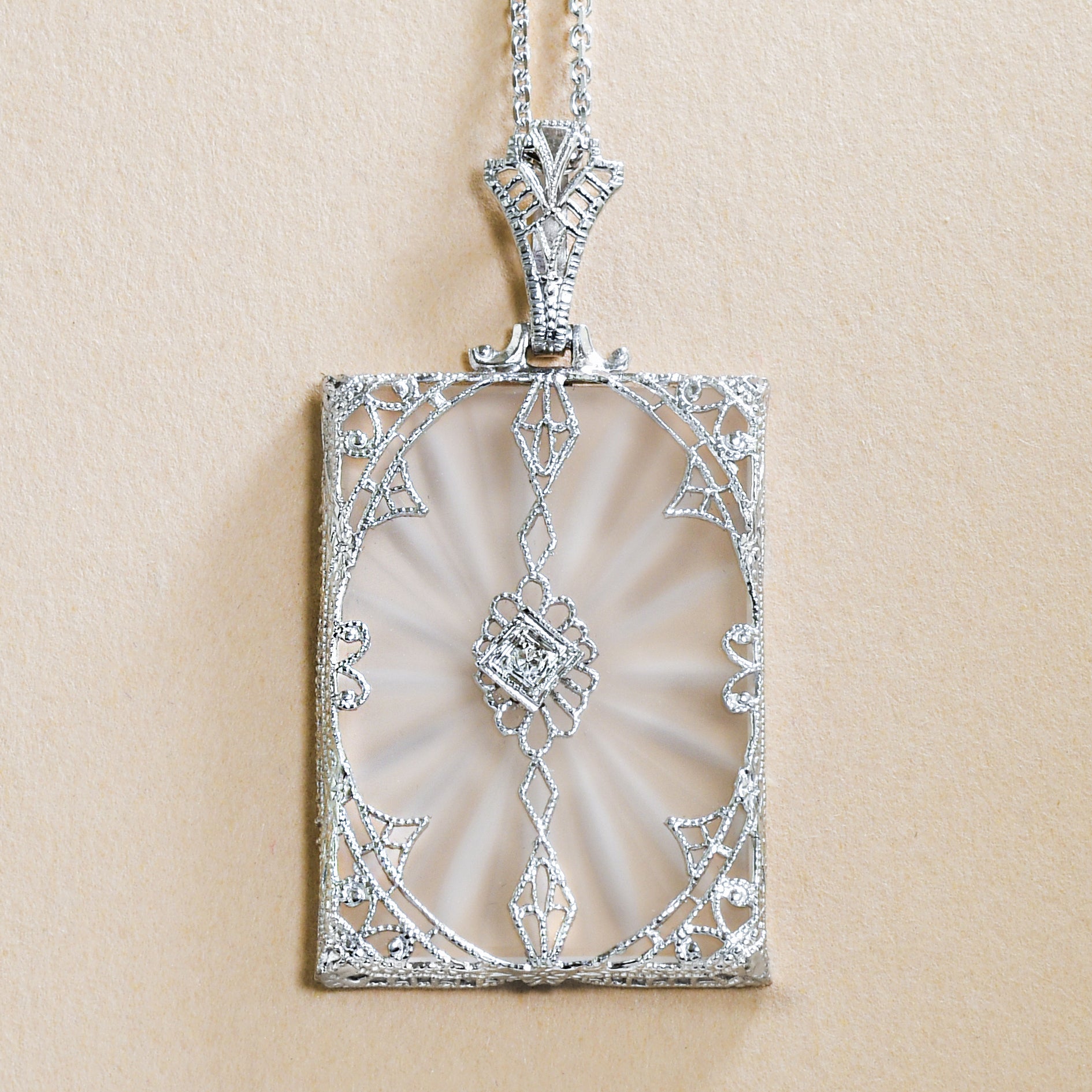 An original, unworn jewel from the collection of our founder, Arthur Plante. This lacy, feminine pendant is fashioned in 14 karat white gold, and has been set with a large,...
