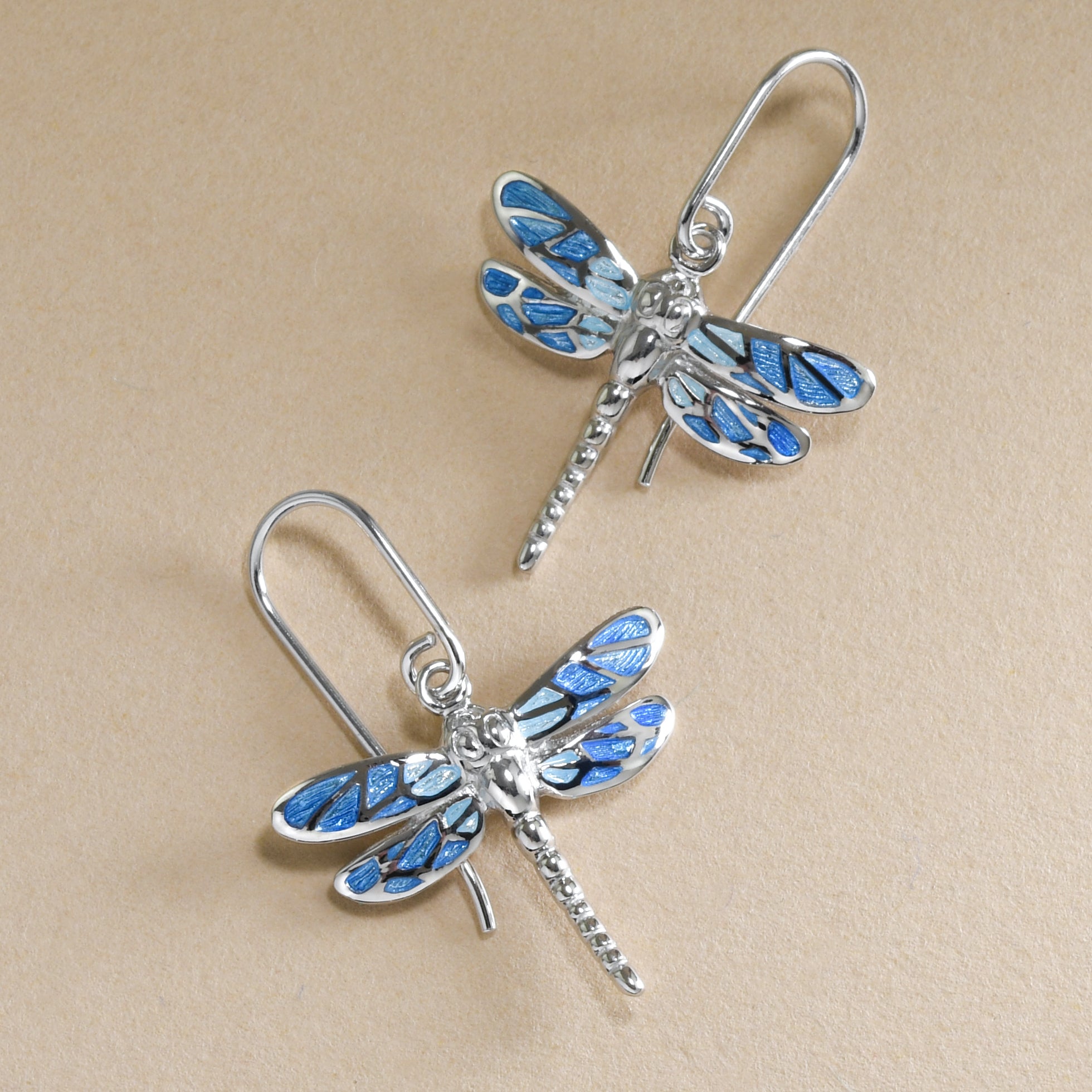 A pair of buzzing dragonflies, captured in colorful French enamel. The dragonfly earrings are sterling silver, and their wings have been decorated in various shades of light to medium blue...