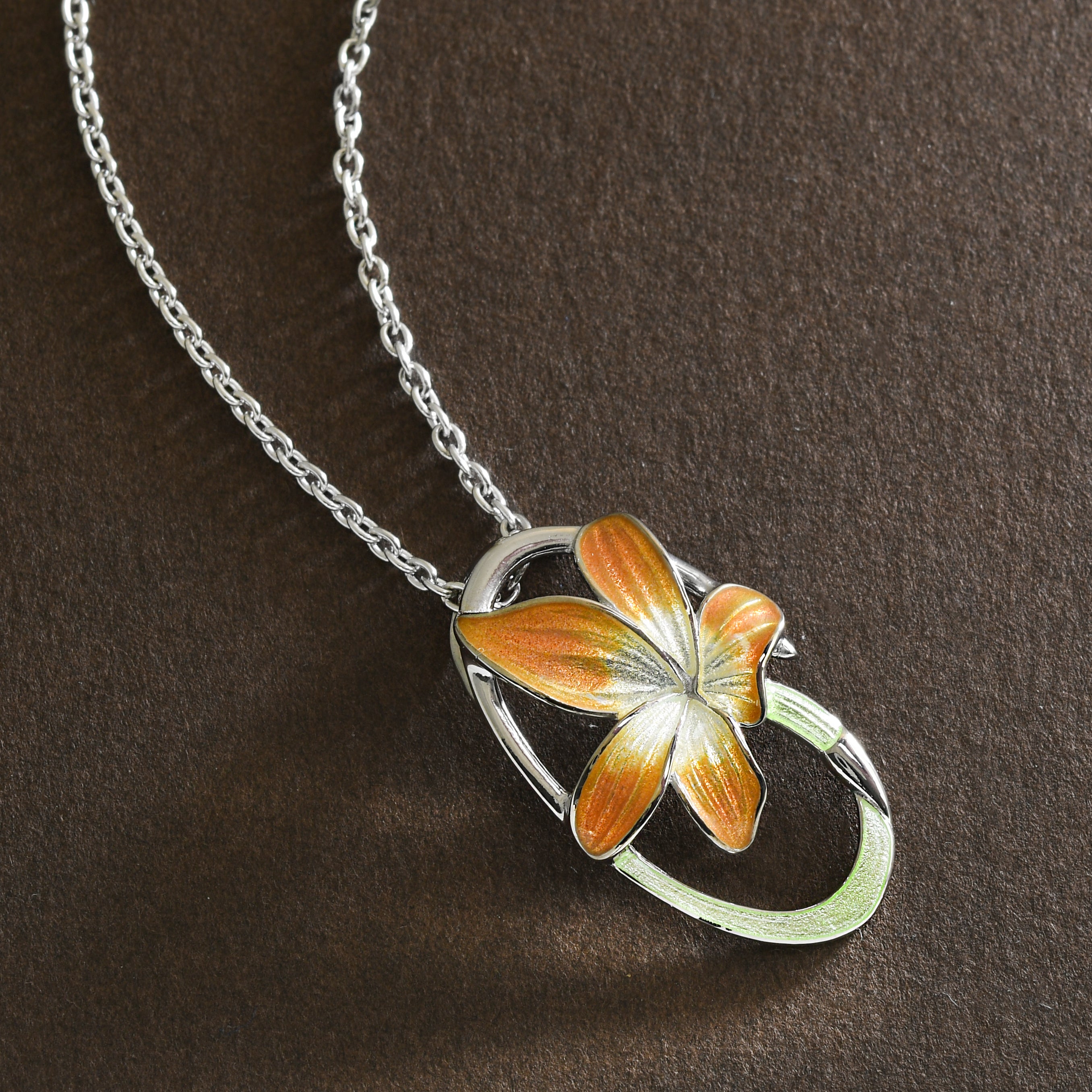 A sweet art nouveau-inspired pendant. The pendant is sterling silver and features a lovely blooming lily, decorated in soft orange and white enamel, with a delicate green enamel stem. French...