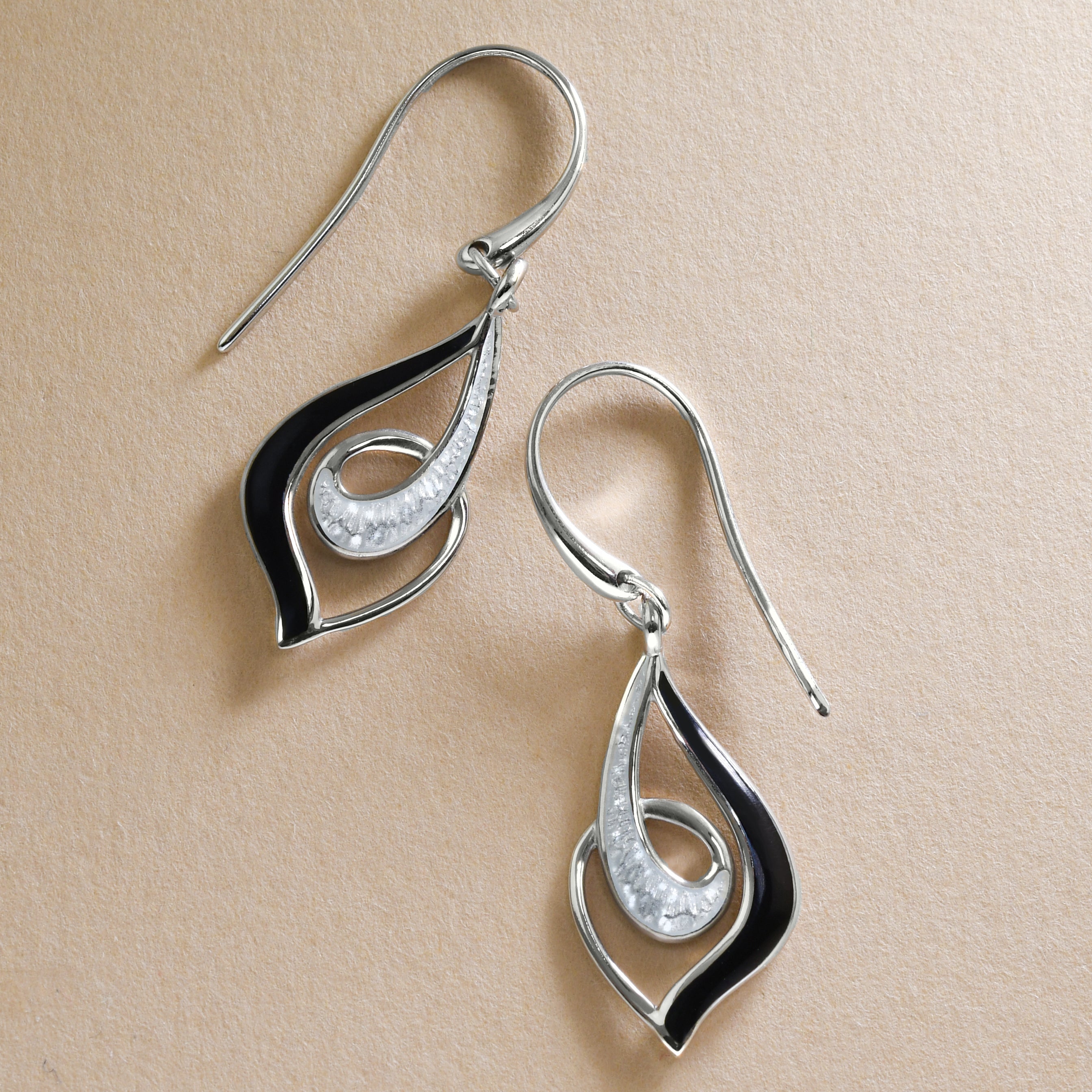 Black and white goes with everything! These sterling silver drop earrings feature both black and white French enamel, which is glass fused over precious metal. The black enamel is solid...