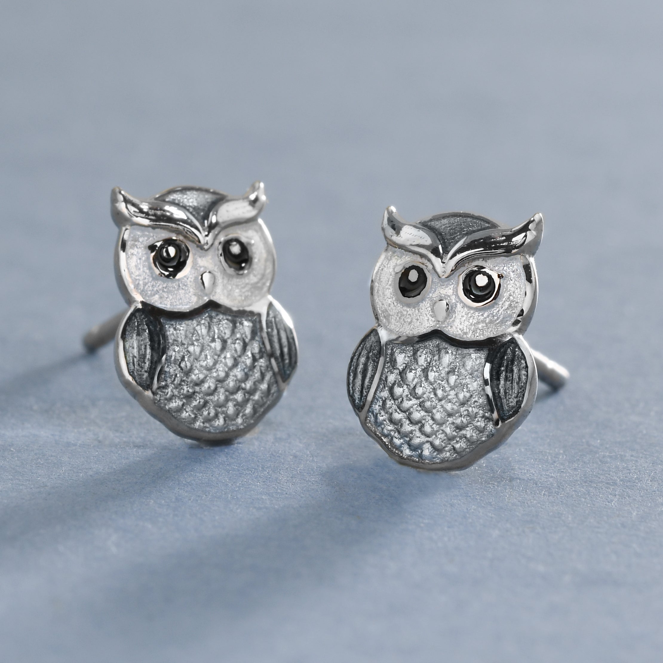 Hoot! A pair of cute owls, rendered in bright gray and white French enamel. The studs are sterling silver, and the French enamel is glass, fused over a carved base...