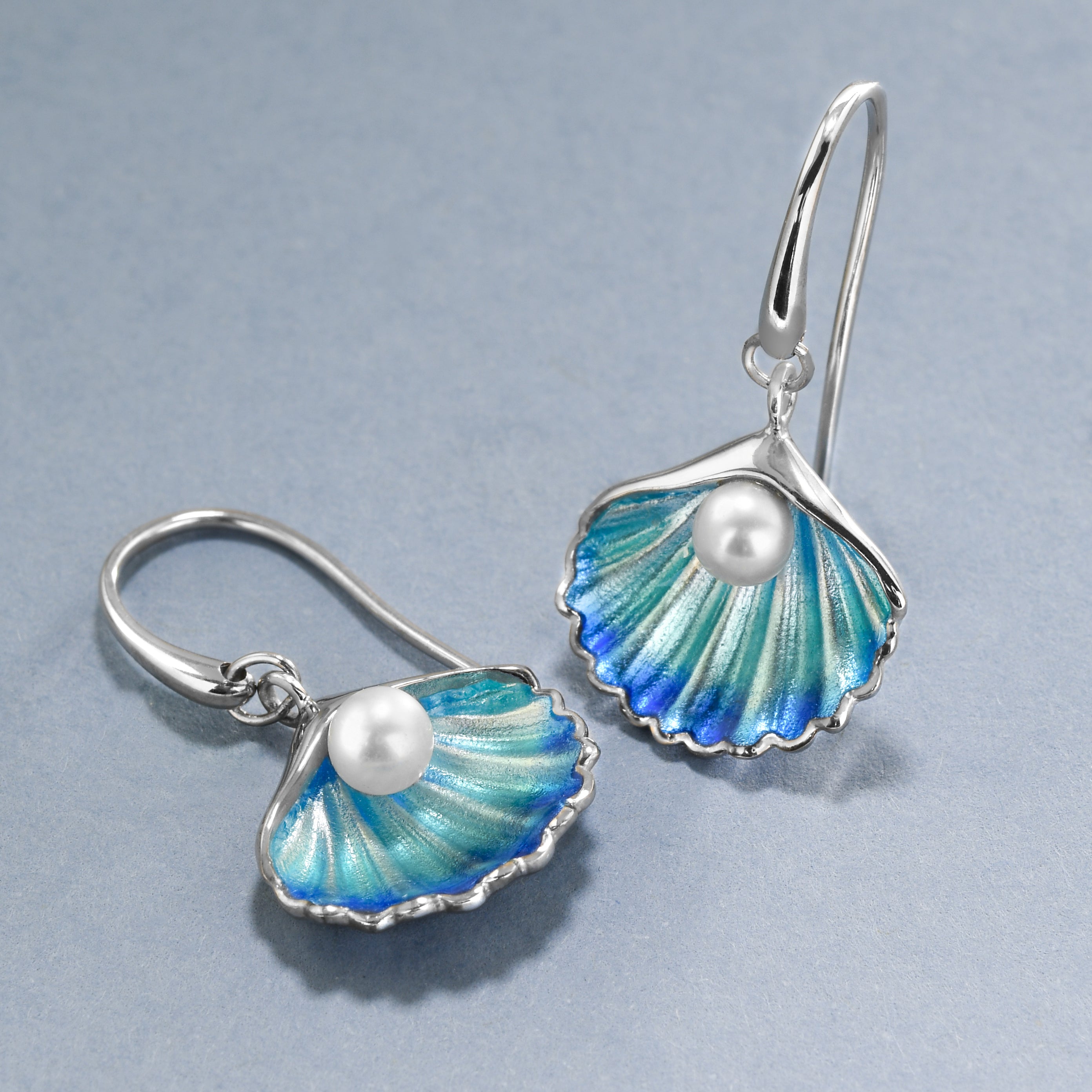 Gleaming treasures from the sea - rendered in vibrant French enamel. These seashell drop earrings are sterling silver and display colors of teal and medium blue, thanks to layers of...