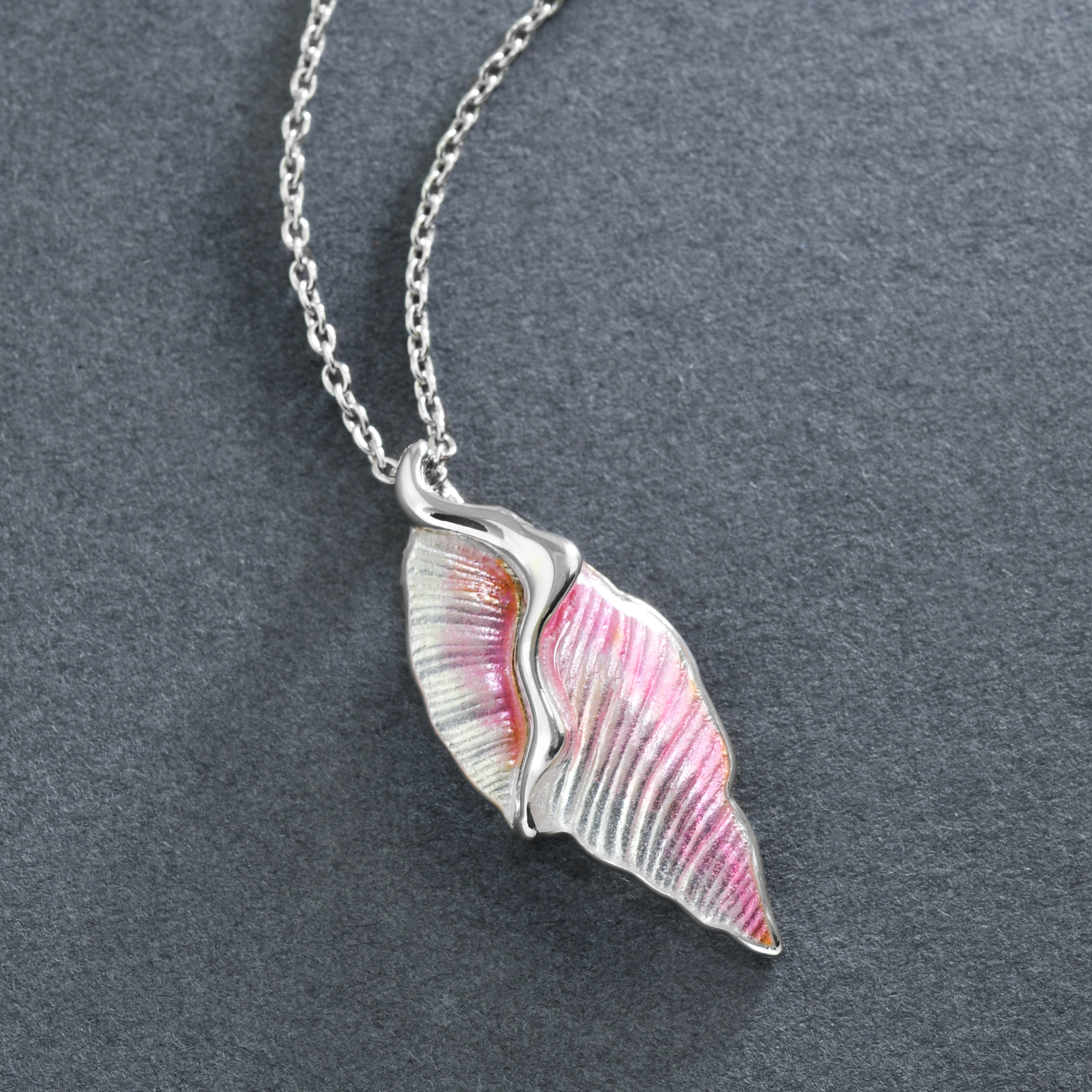 Listen to the roaring ocean with our pretty pink conch shell pendant! Crafted in sterling silver, the shell is decorated with a gradient of pink French enamel. The enamel is...