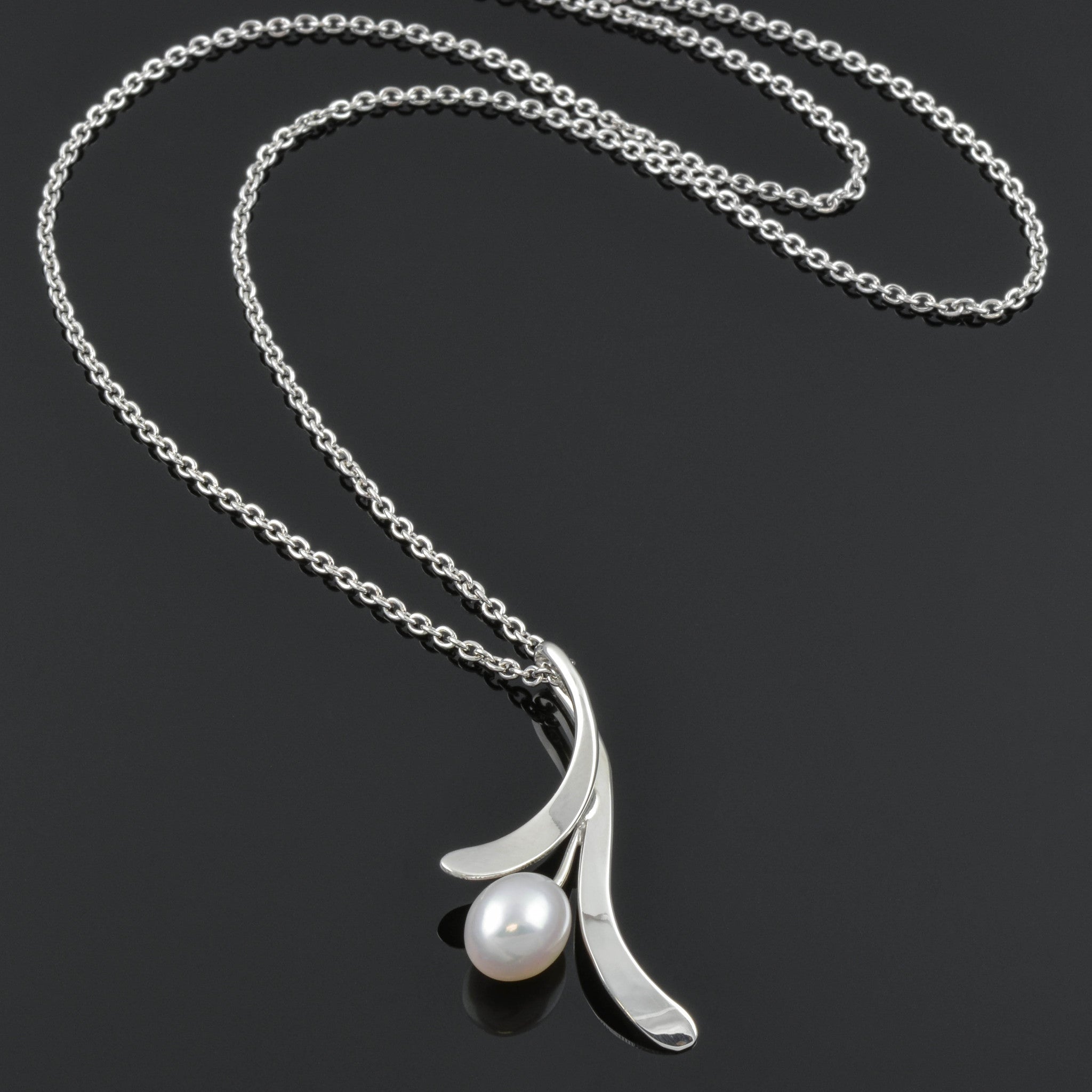 A gorgeous sterling silver pendant, handmade by Massachusetts artist Tom Kruskal. A stylized leaf has been forged from silver wire, and nestled within is a single oval freshwater pearl. The...
