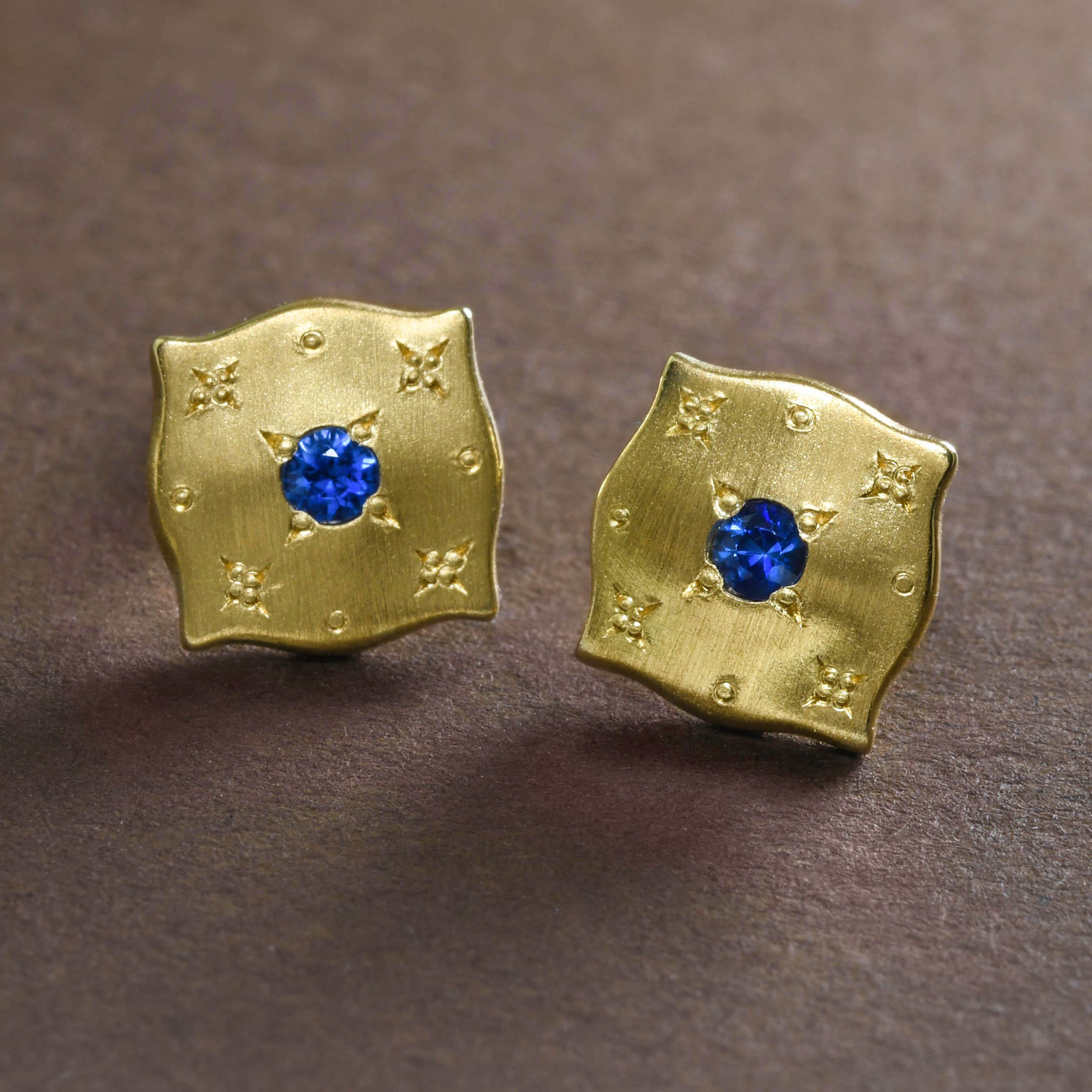 As if unearthed from an ancient hoard, these golden treasures will glow as they adorn your ears! Handmade in 14 karat yellow gold, the earrings feature oval discs decorated with...