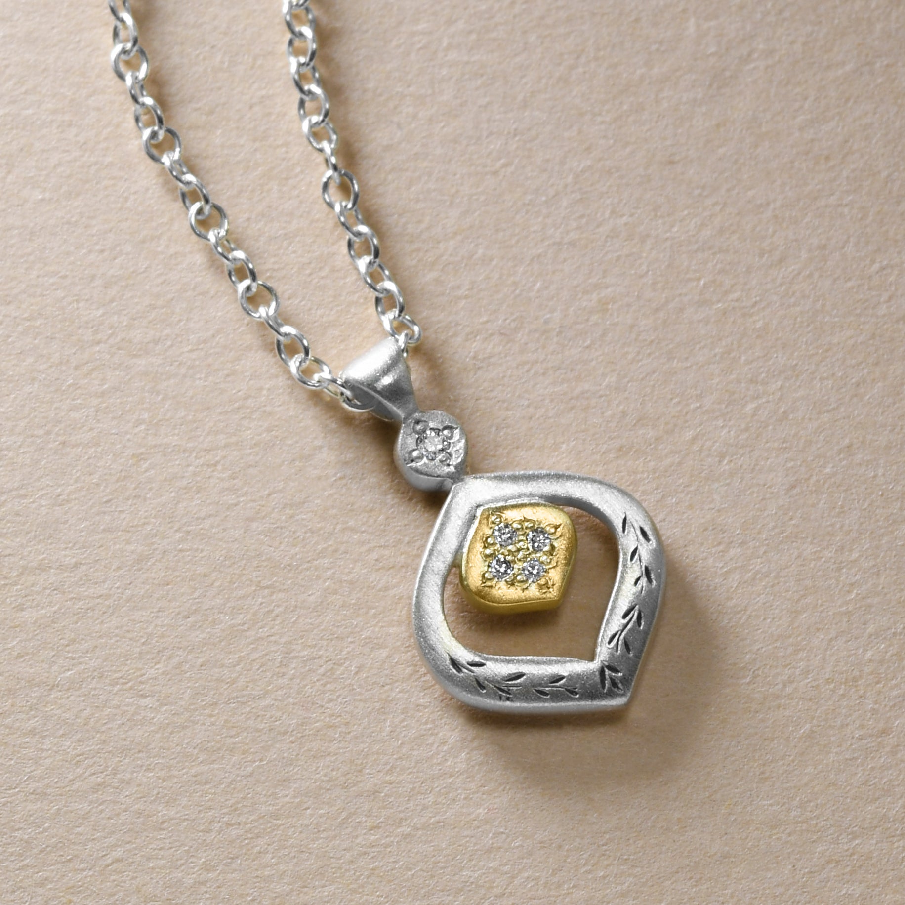 Precious silver and gold nest together to hold sparkling diamonds in this pendant by designer Adel Chefridi. Adel works in upstate New York, where he designs and hand makes jewels...