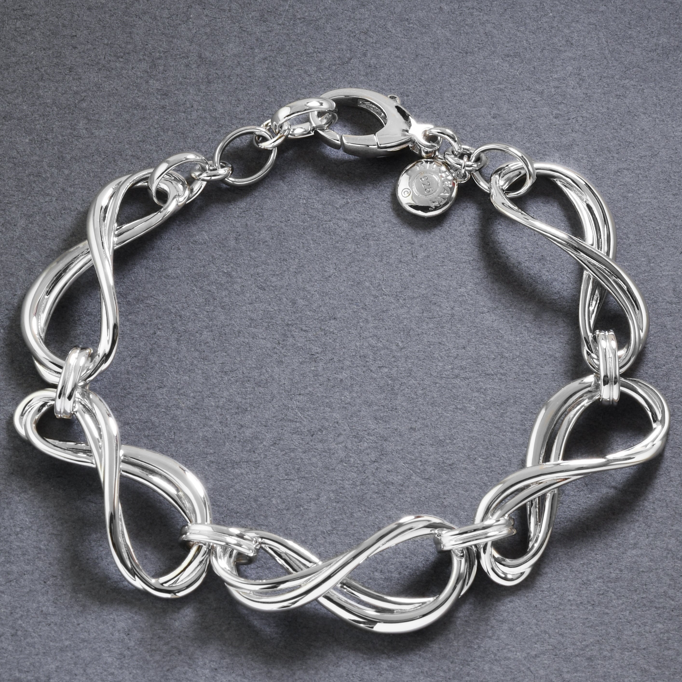 Sinuous links of silver, gleaming with an Art Nouveau flair, combine to create this fabulous bracelet. Crafted in sterling silver, each link is an asymmetrical infinity motif. The links are...