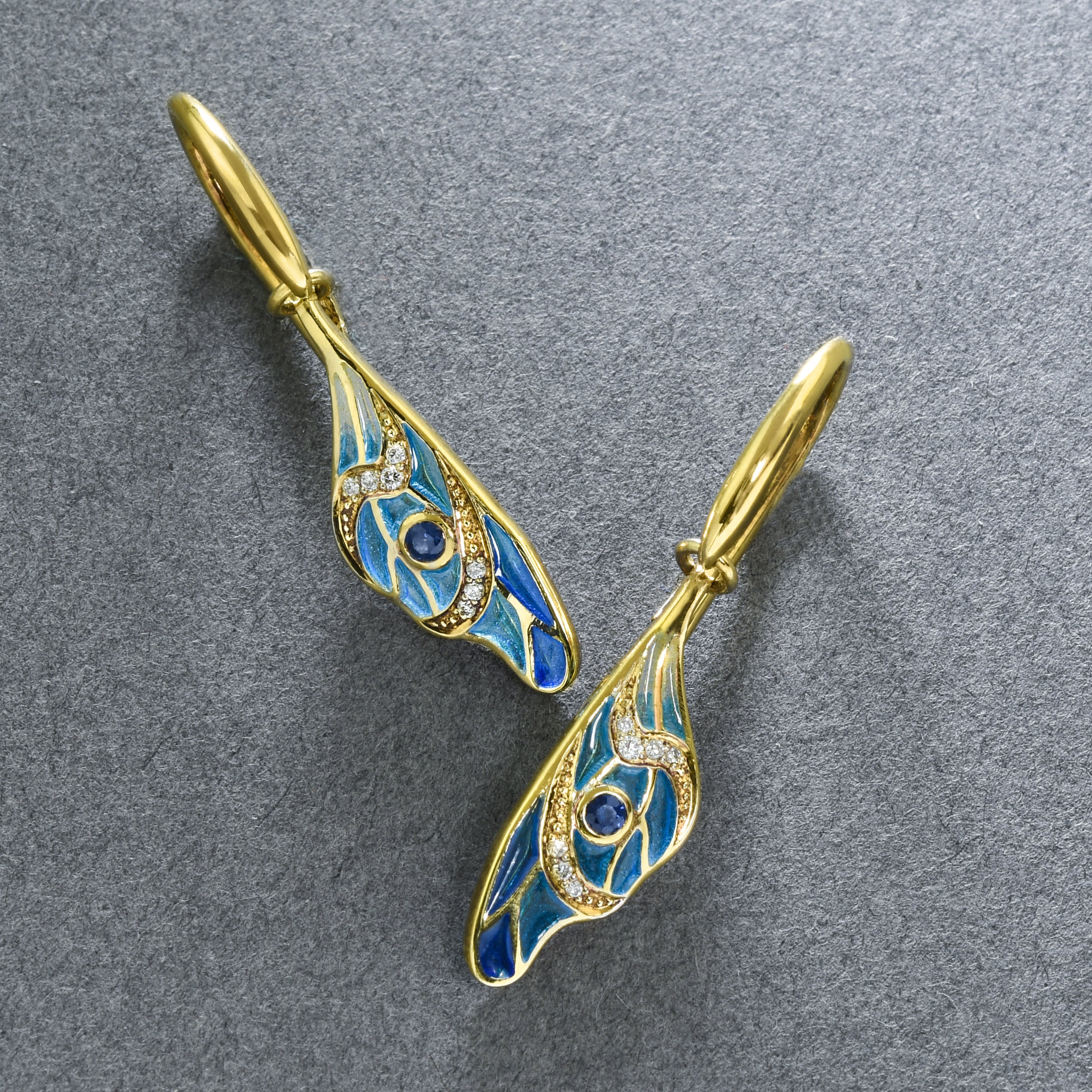 Gleaming, gossamer wings of a butterfly will flutter at your ears in this pair of delicate earrings. The earrings are yellow gold vermeil (gold plated over sterling silver) and have been decorated with "plique-a-jour" French enamel. Plique-a-jour enamel is a complex technique similar to stained glass, where enamel (powdered glass) is suspended in between channels of precious metal. The butterfly wings have a gradient of clear to deep blue enamel, and earth-mined diamonds decorate the veins of the wings. A single genuine blue sapphire creates the "eye" of each wing pattern.
