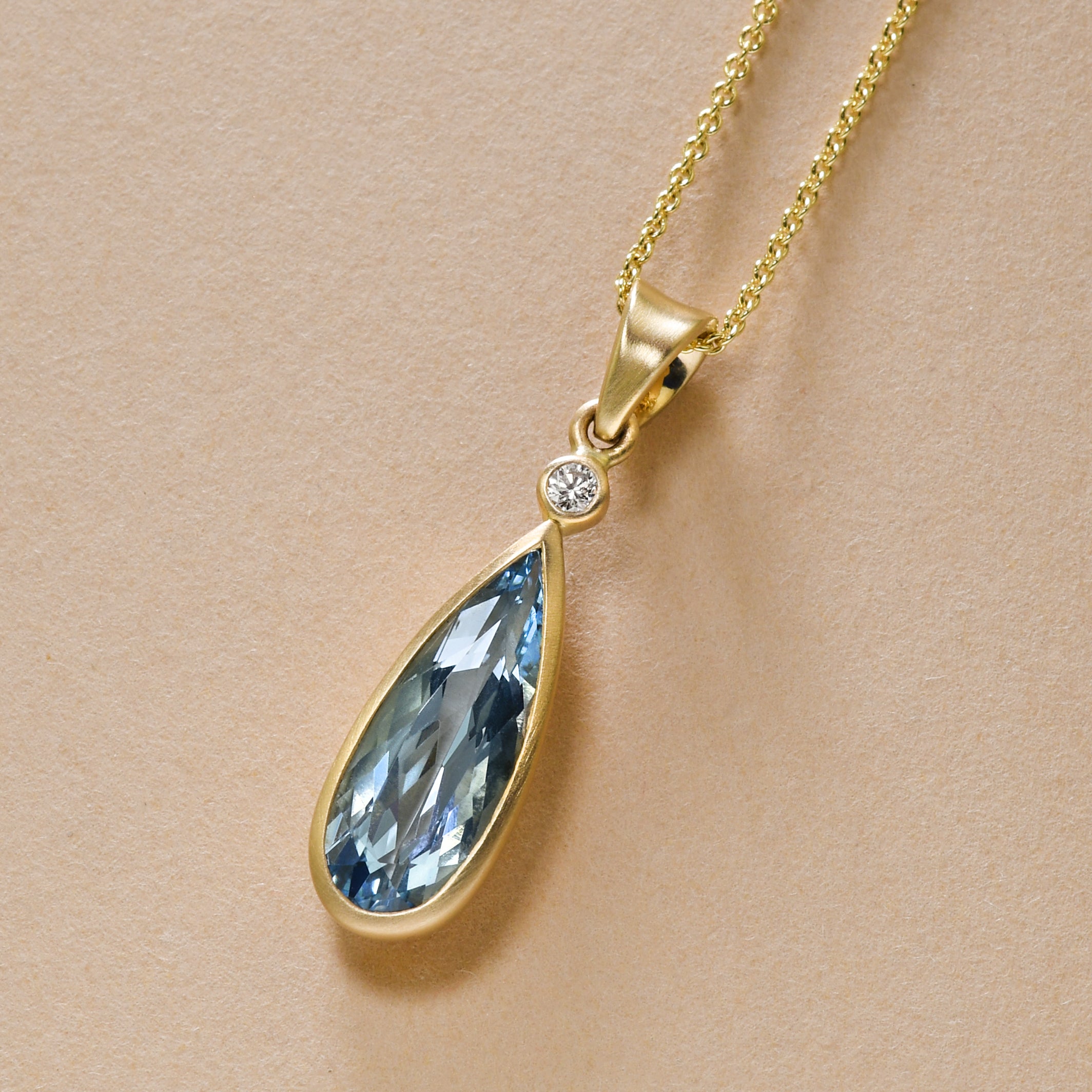 Lavishly long and sensually stylish - this aquamarine pendant is made special by a sparkling diamond top and satin finish. The aquamarine gemstone is genuine and has been faceted as a long pear shape. It weighs 1.88 carats and has a pleasing light greenish-blue hue and great sparkle. The round diamond accent is earth-mined, weighs .03 carats, and has GIA H/VS2 color/clarity grades.