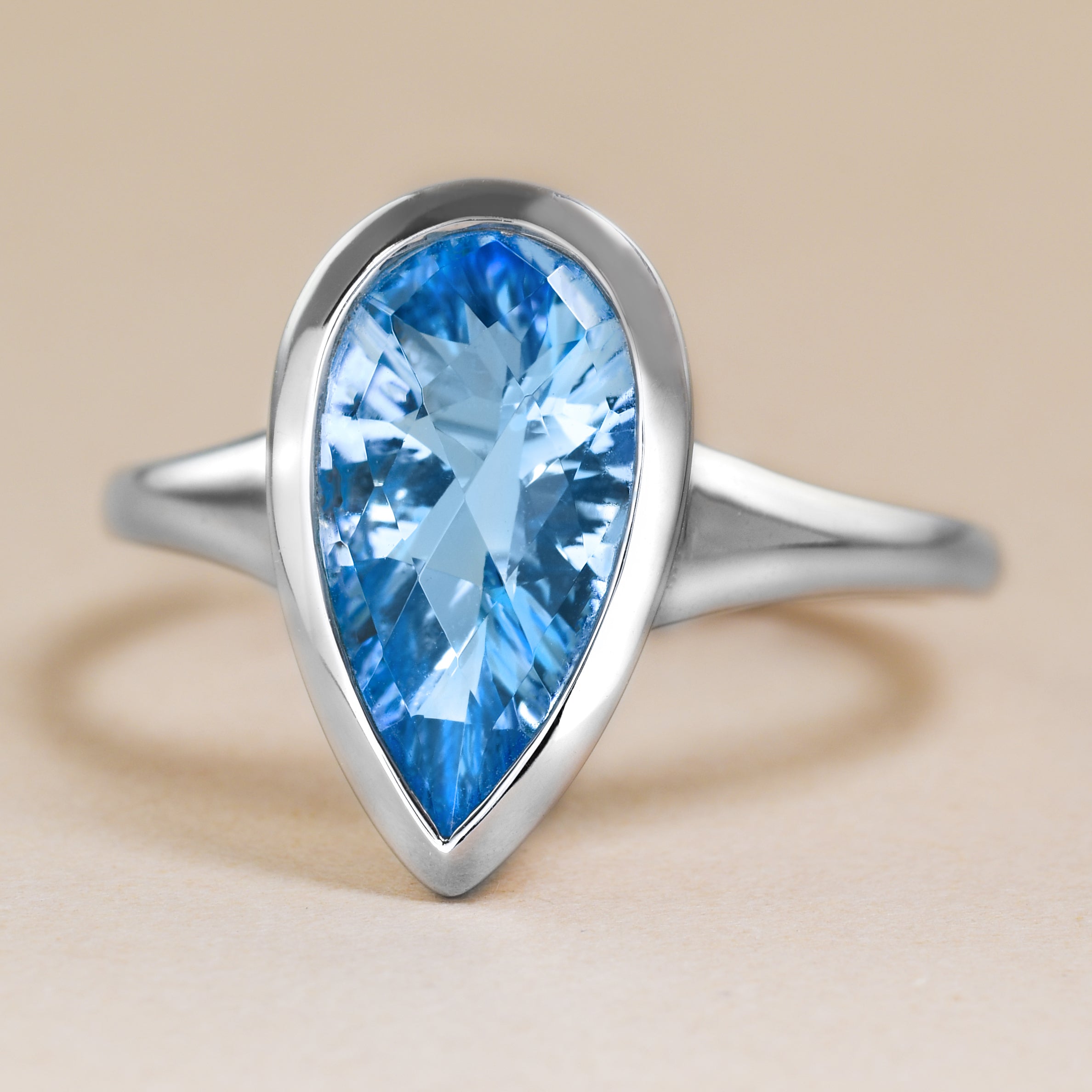 A big, single raindrop of blue topaz is showcased in this modern ring. Styled in 14 karat white gold, this ring features a secure bezel setting and a sleek, tapered...
