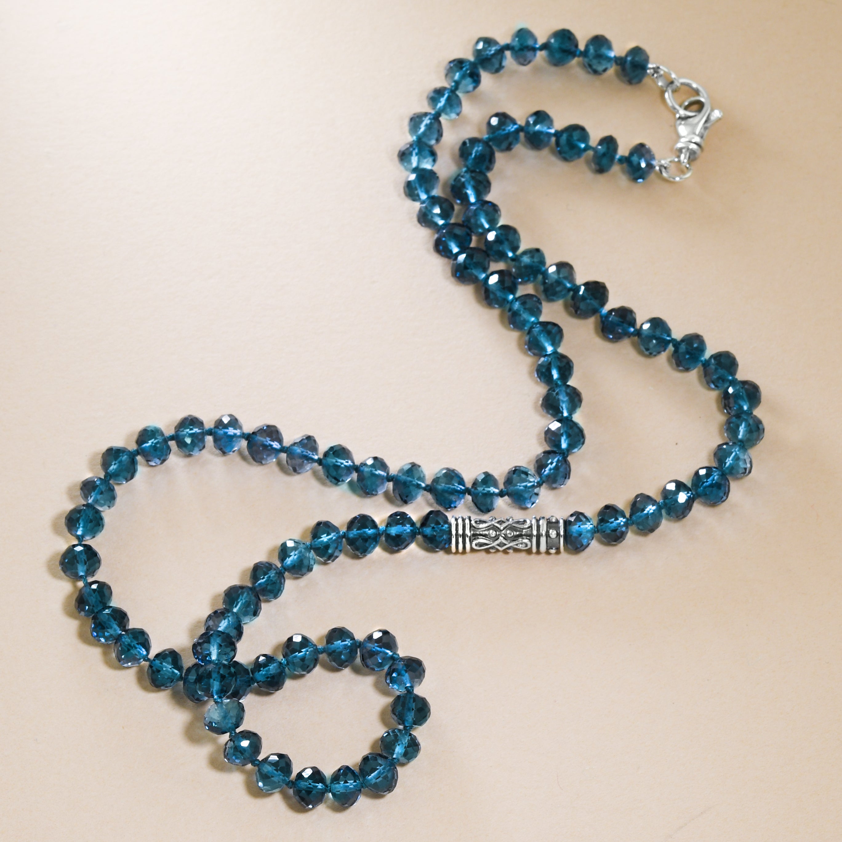 A strand of deep teal-blue topaz beads (known as London blue) will glitter at your neck. The beads are faceted rondell shapes, which catch the light at every turn (pictures...