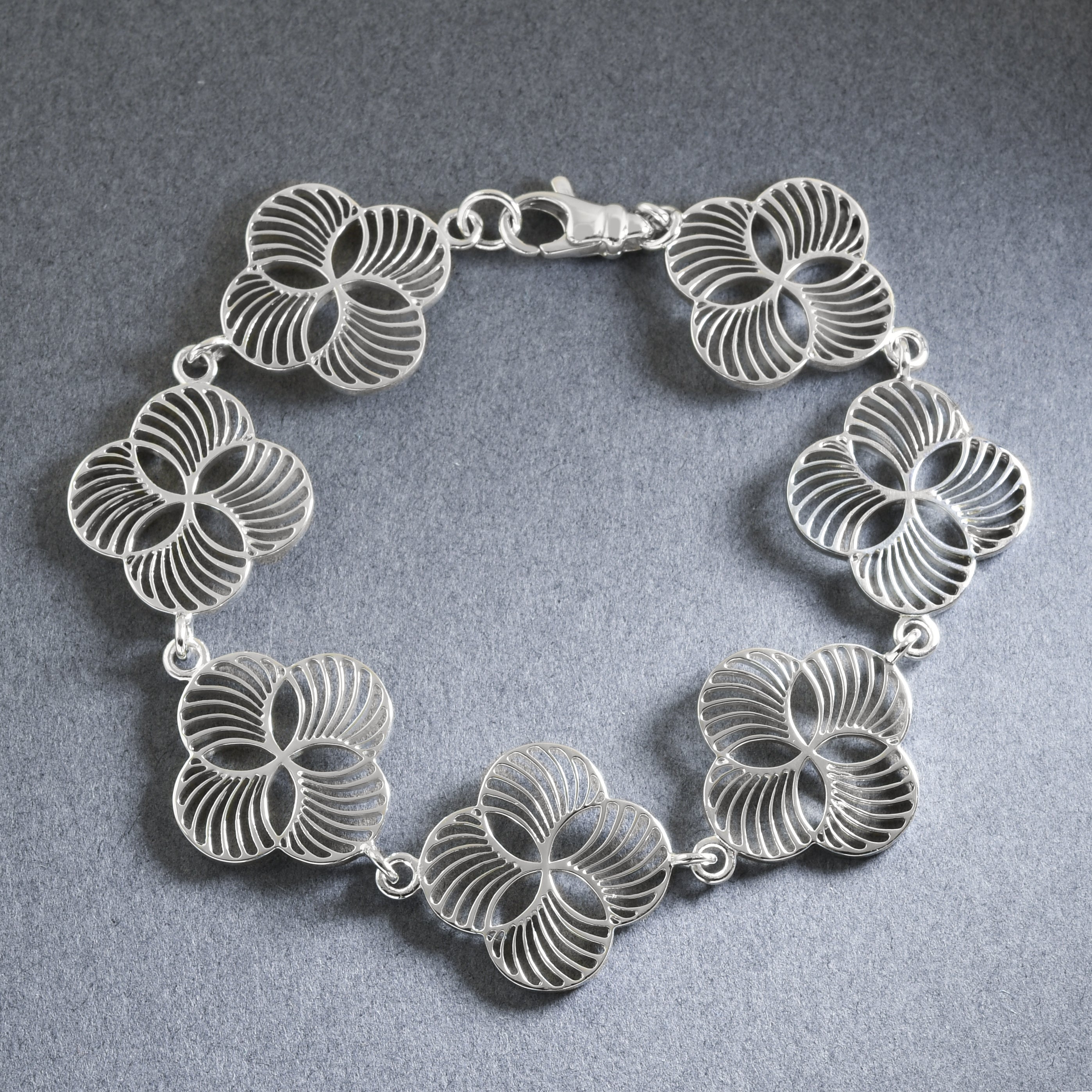 Eight open-work links of polished sterling silver create this pretty, airy bracelet. The links have been styled as "quatrefoil fan" shapes and connect with double rings. The bracelet measures 7.75"...