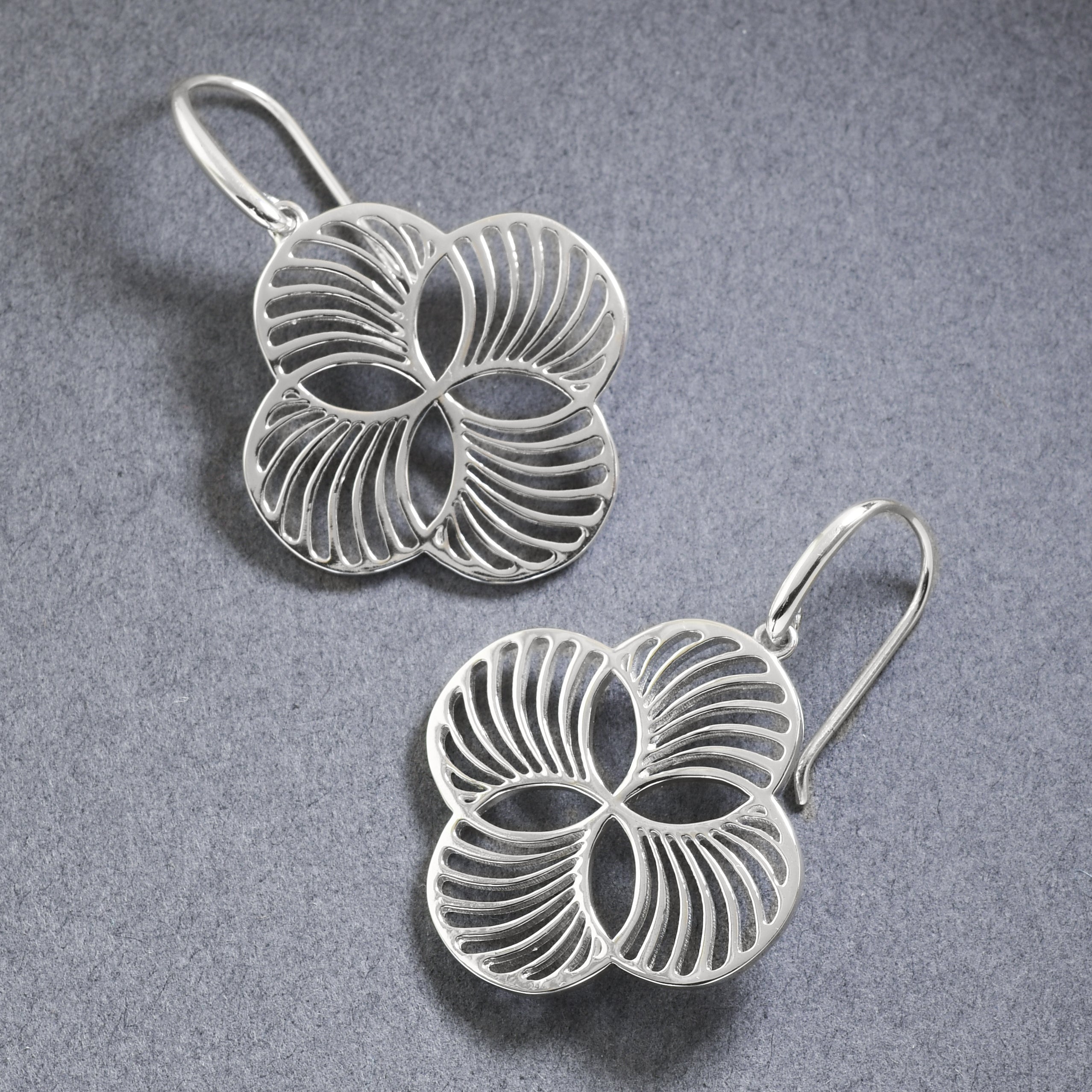 Pretty, open-work drop earrings, in polished sterling silver! The drops are designed as "quatrefoil fans" and dangle from sculpted French wires. The drops measure just over one inch in diameter.