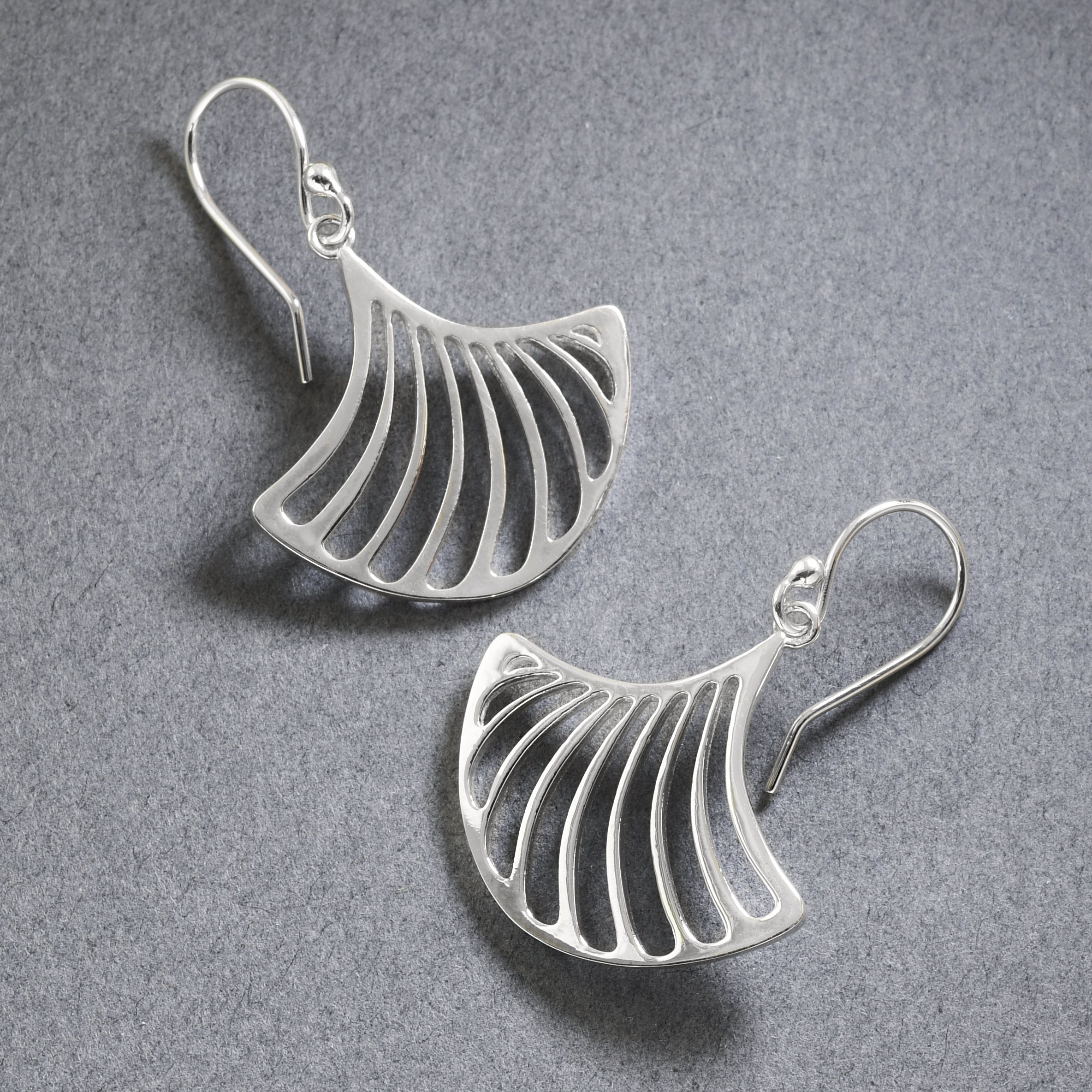 Modern, open-work fans swing to-and-fro in this pair of earrings. The earrings have been fashioned in sterling silver, and have French wire tops. The fans measure 7/8 inches long by...