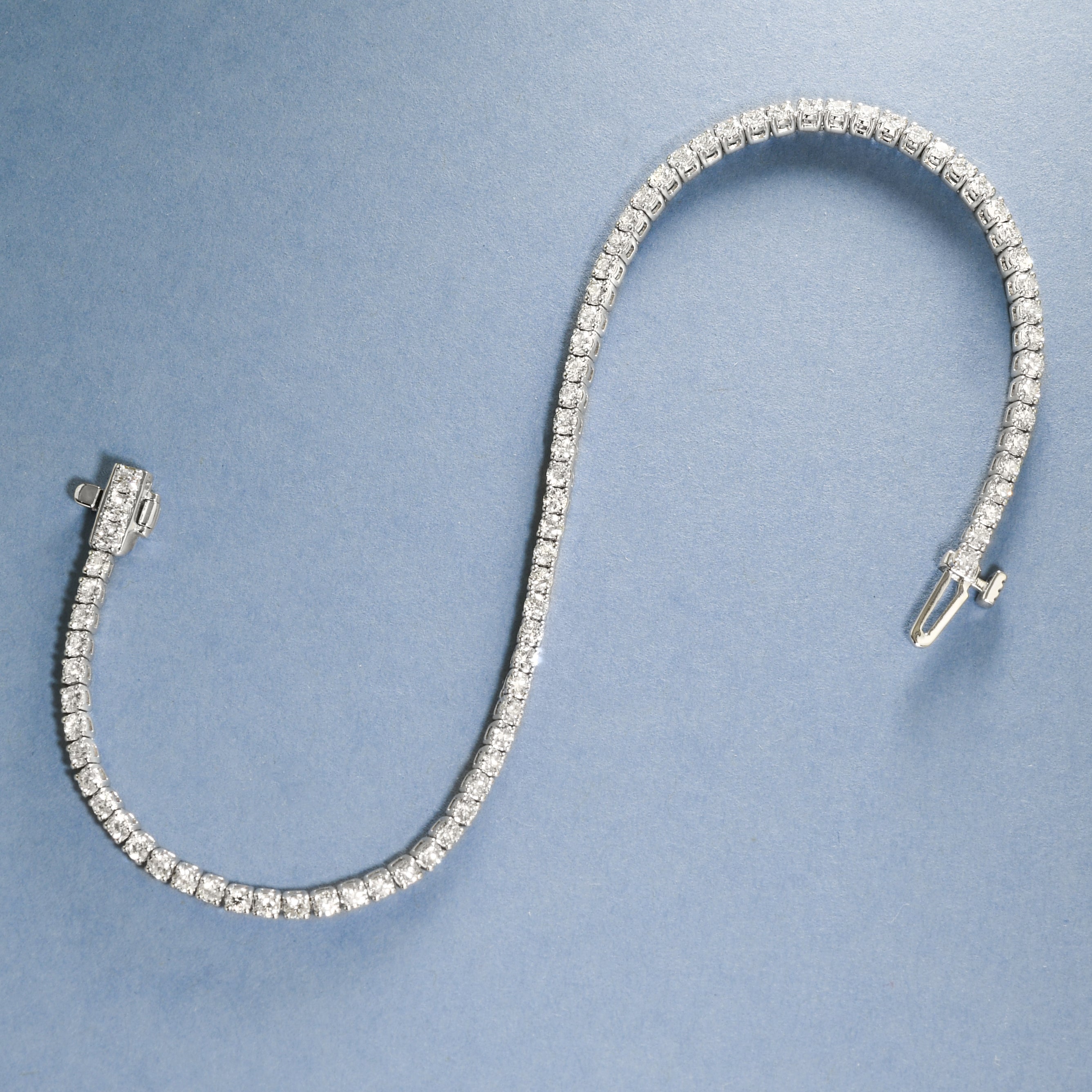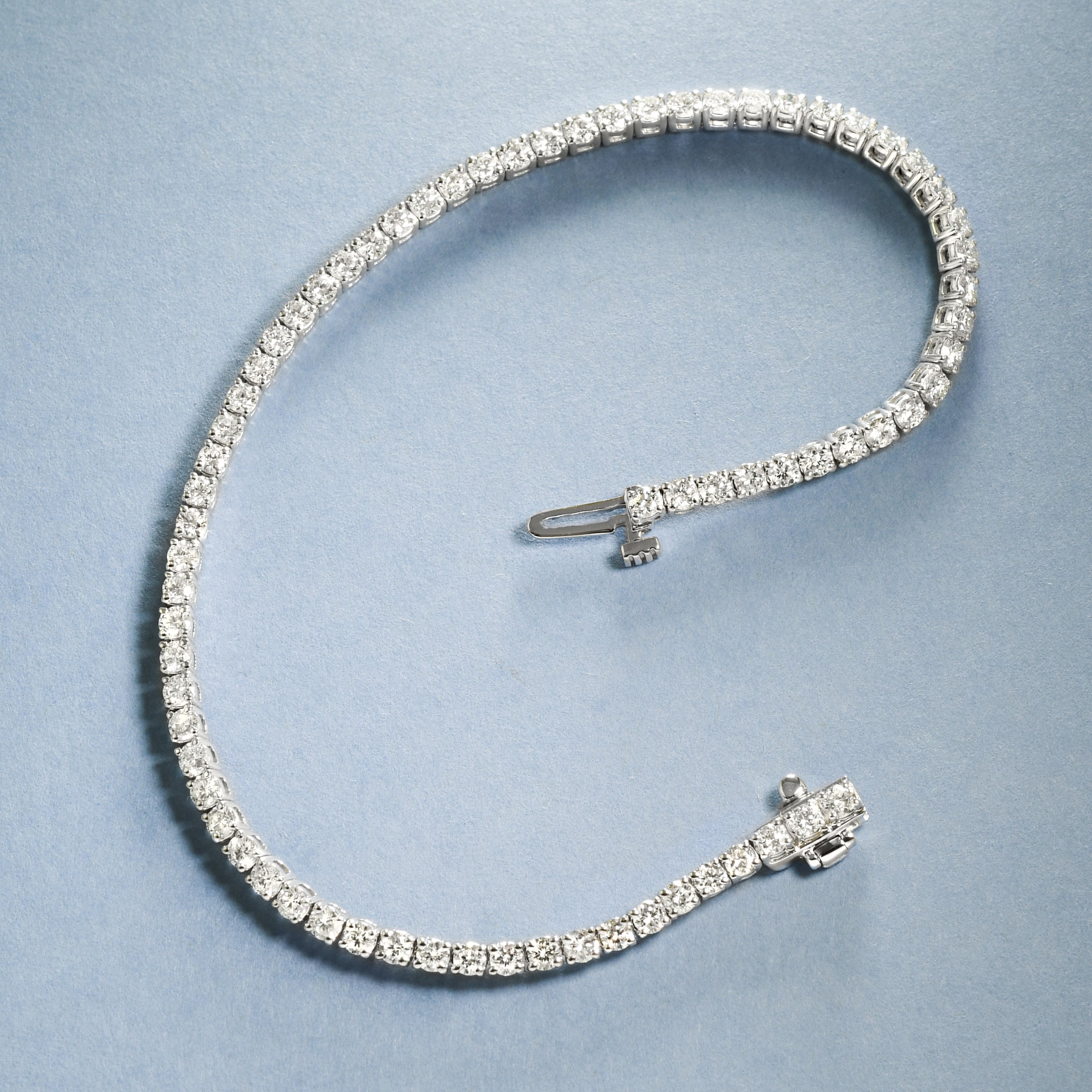 A shimmering river of fabulous diamonds will encircle your wrist when you don this spectacular bracelet. Crafted in a classic style, the bracelet features articulated basket links with four prongs...