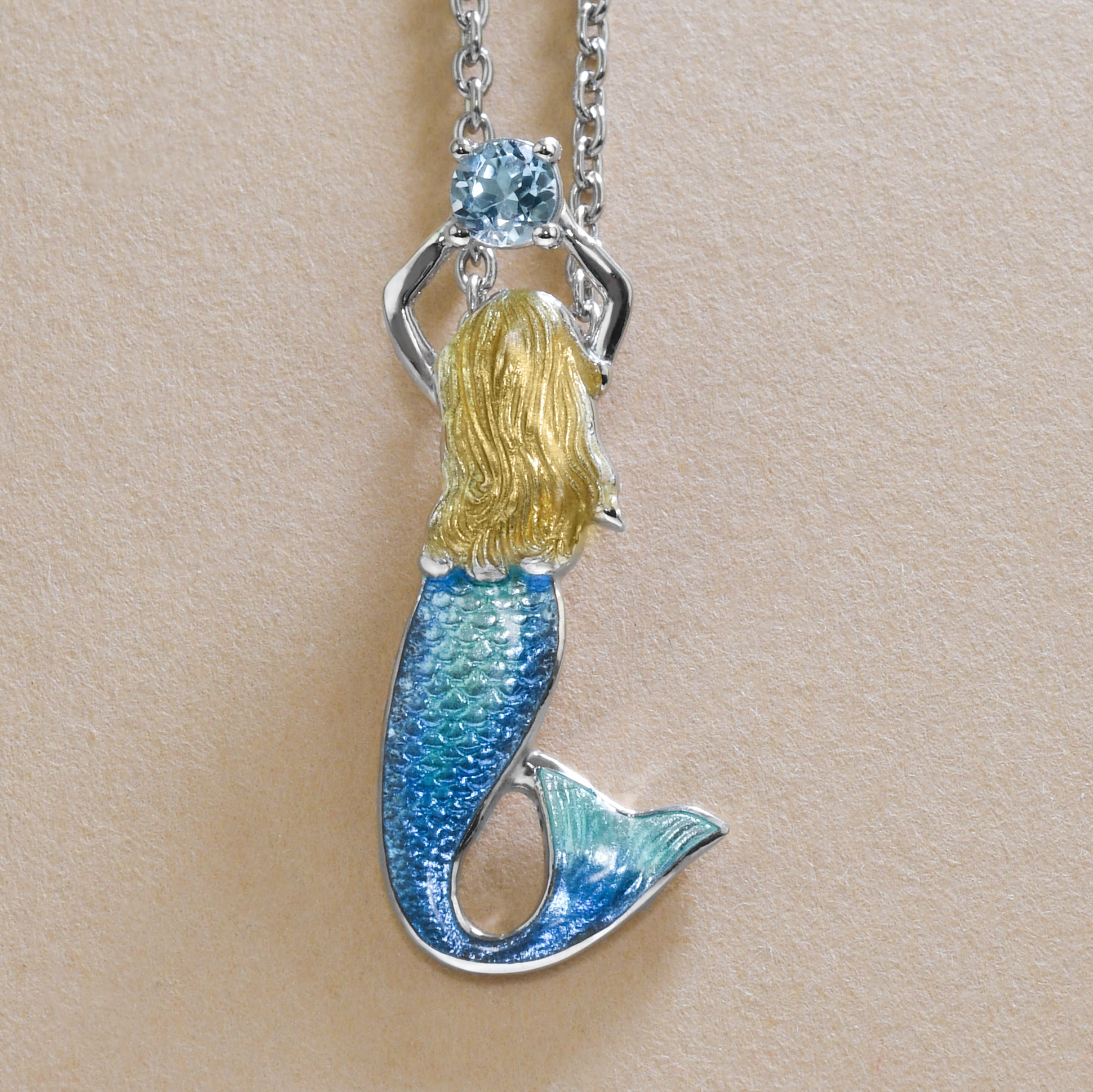 This fantastic siren-of-the sea dazzles with vibrant French enamel and a bright, light blue topaz gemstone. The mermaid has been made in sterling silver and decorated with translucent, colorful enamel. ...