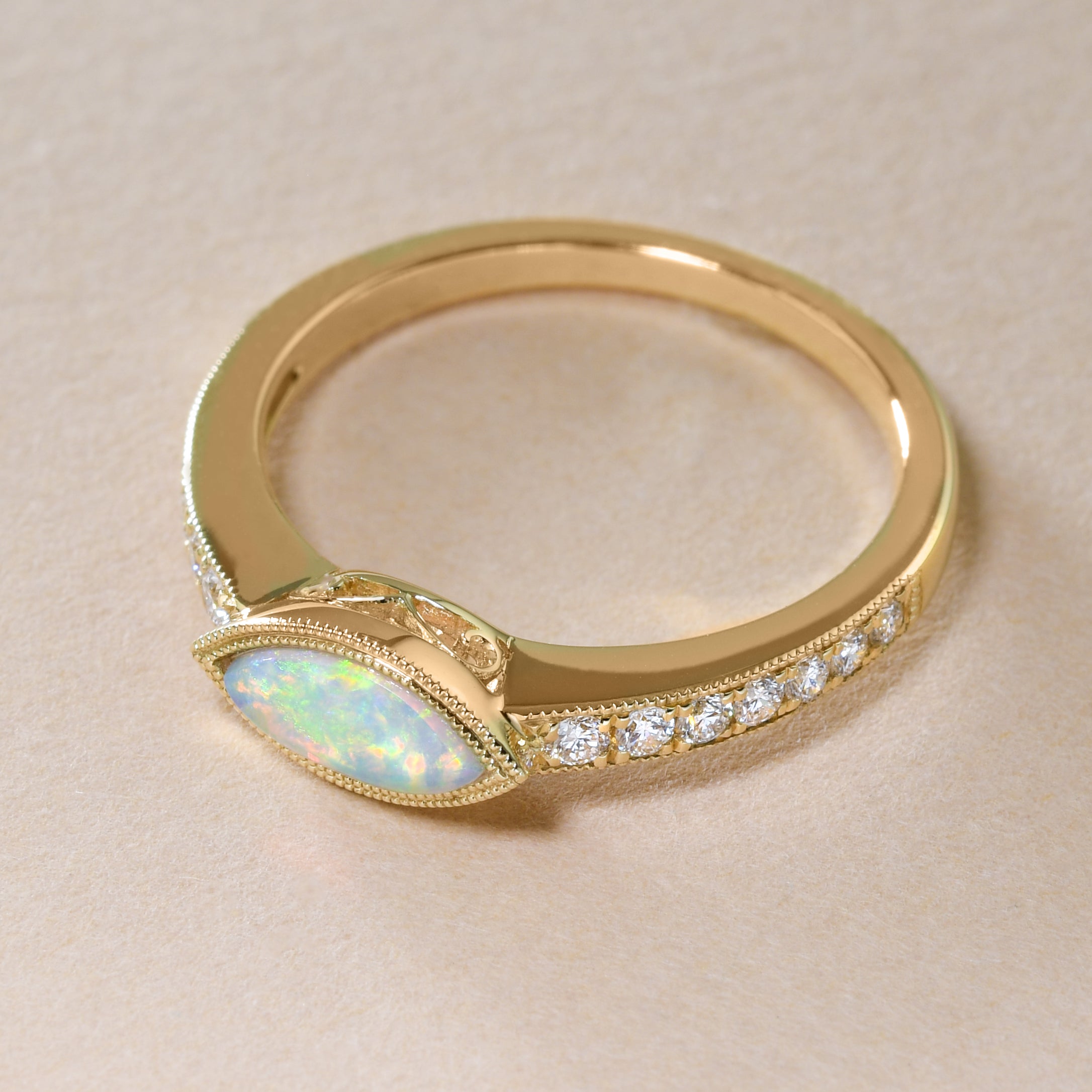 A low profile and sleek styling make this opal and diamond ring easy to wear! Fashioned as a band-style ring in polished 14 karat yellow gold, the ring features vintage-inspired...