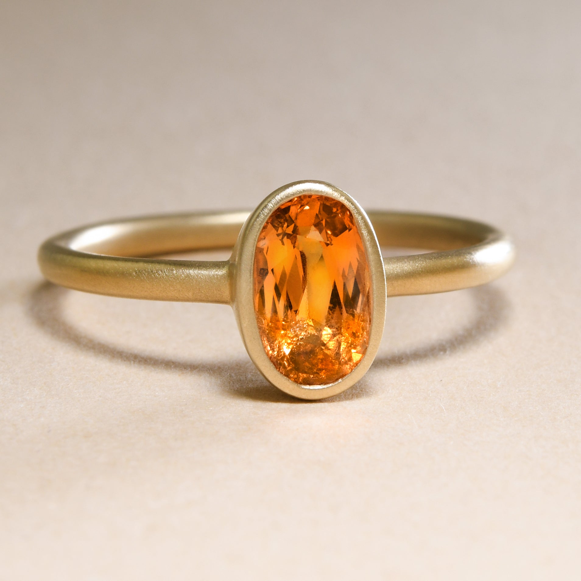 A smooth bezel and sleek satin finish lend a modern flair to this juicy gemstone ring! The ring is 14 karat yellow gold and holds an elongated oval garnet. The...