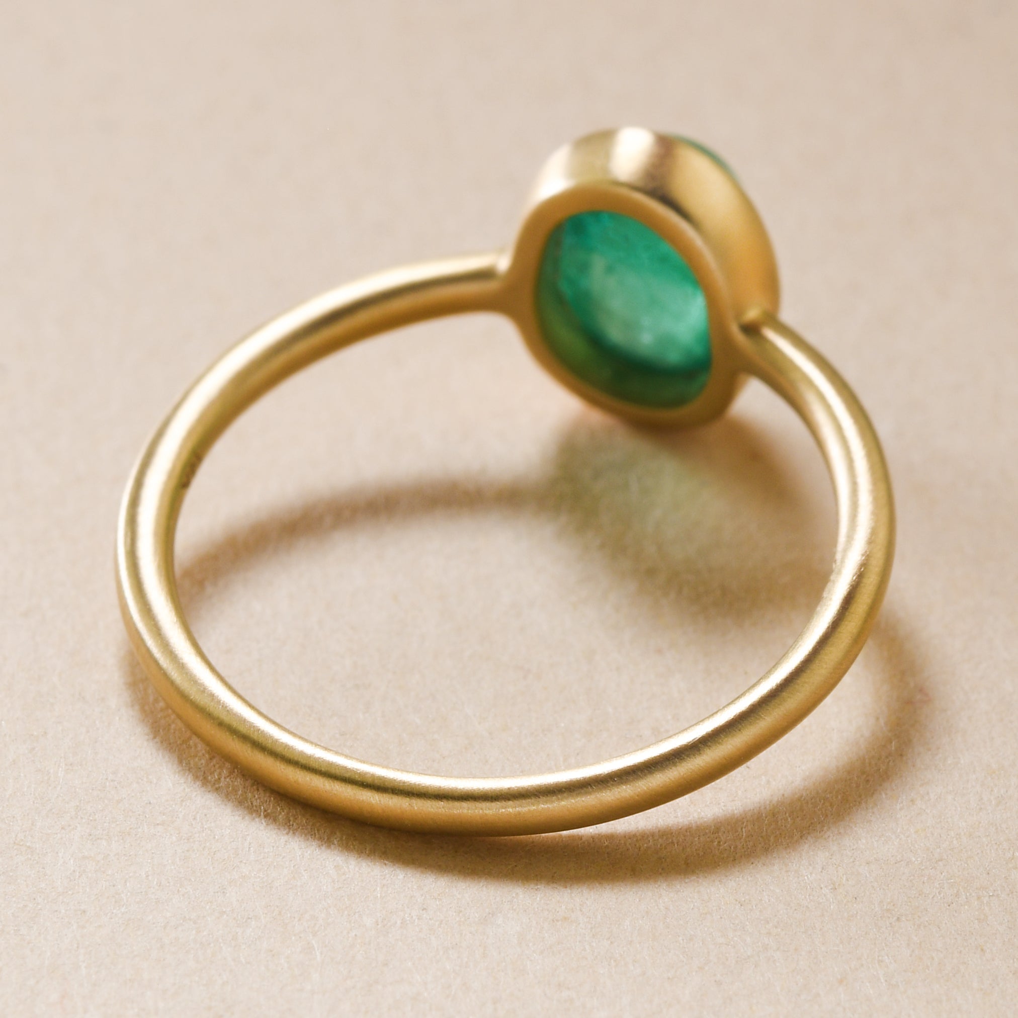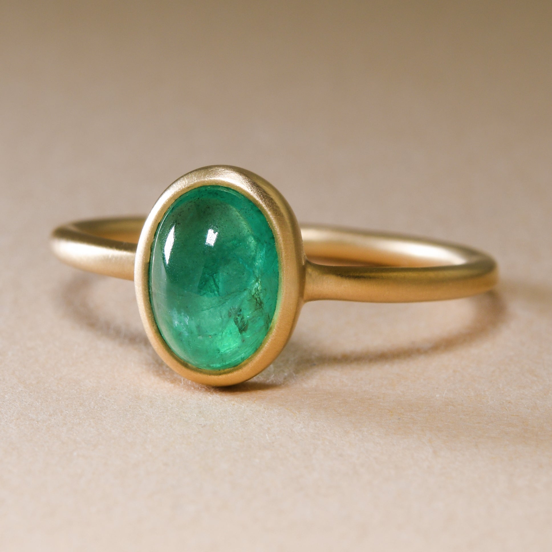 A juicy, verdant-green emerald needs no other decoration than a simple gold setting to let it shine! The genuine emerald has been fashioned as an oval cabochon, with a sleek,...