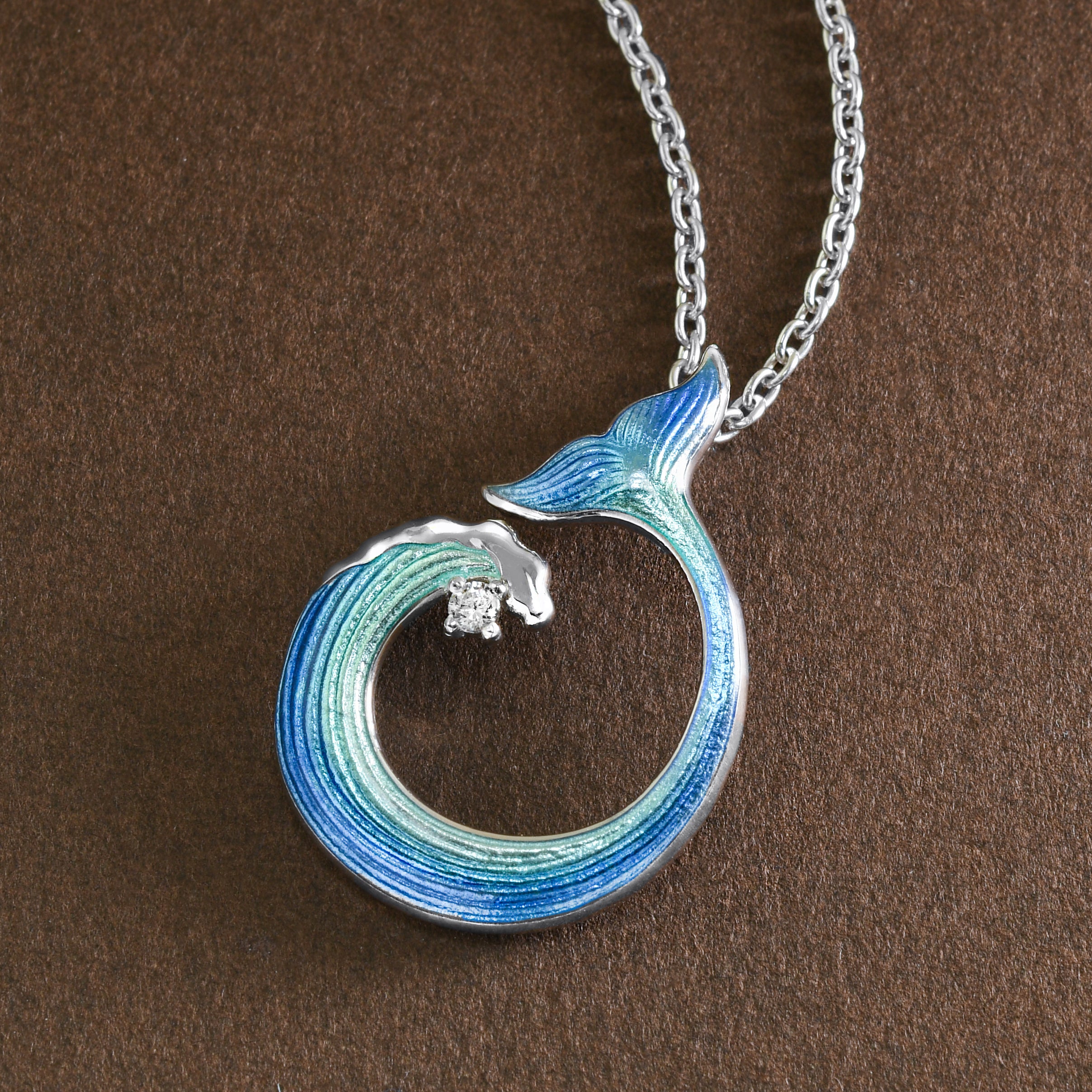 The perfect nautical pendant: at the top, a mermaid's tail, and the bottom, a cresting wave! Crafted in sterling silver with luminous French enamel (powdered glass fused over precious metal),...