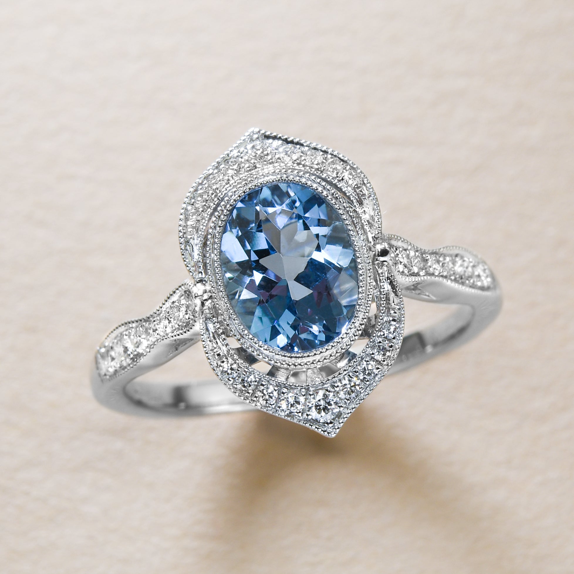 Fall under the spell of our alluring aquamarine and diamond ring. Fashioned in 14 karat white gold, the ring is brimming with vintage-inspired details, like a double-milgrain bezel, bead-style prongs...